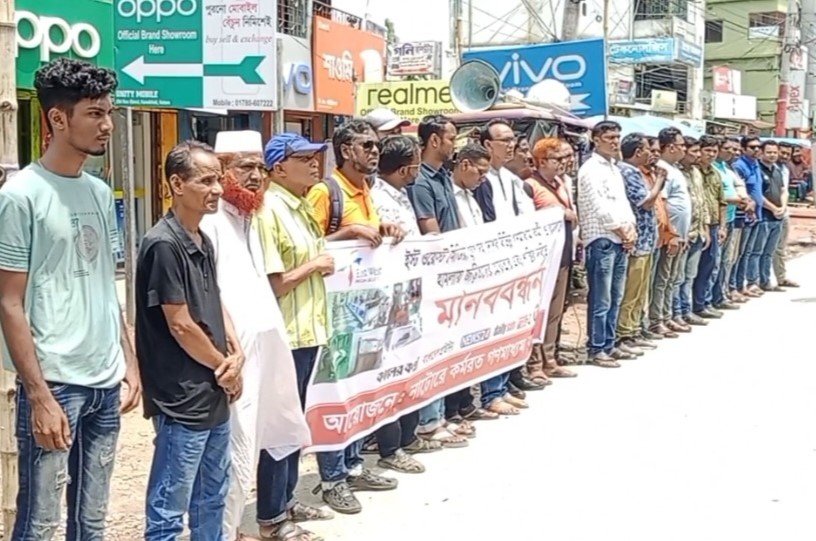 বাংলাদশে প্রতিদিন, নিউজ টোয়েন্টিফোর এবং কালের কণ্ঠসহ দেশের বিভিন্ন গণমাধ্যম কার্যালয় ভাংচুরসহ গণমাধ্যমর্কমীদের উপর হামলার প্রতিবাদ ও দোষীদের দৃষ্টান্তমুলক শাস্তির দাবীতে নাটোরে মানববন্ধন অনুষ্ঠতি হয়েছে।