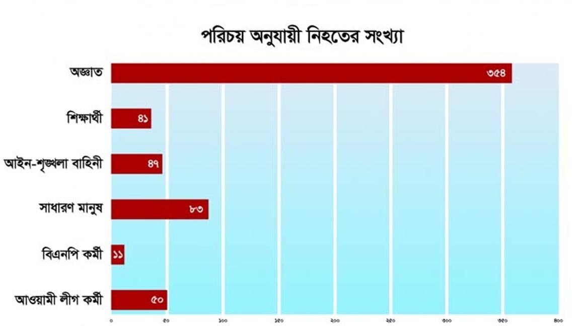 বাংলাদেশের গণমাধ্যম দৈনিক প্রথম আলোতে প্রকাশিত (১৫ জুলাই থেকে ৩১ আগস্ট) সংবাদ বিশ্লেষণ করে ৫৯১ জনের নিহতের তথ্য পাওয়া গেছে।