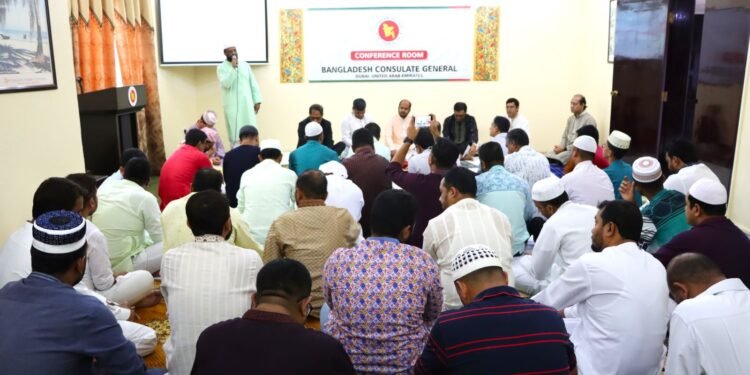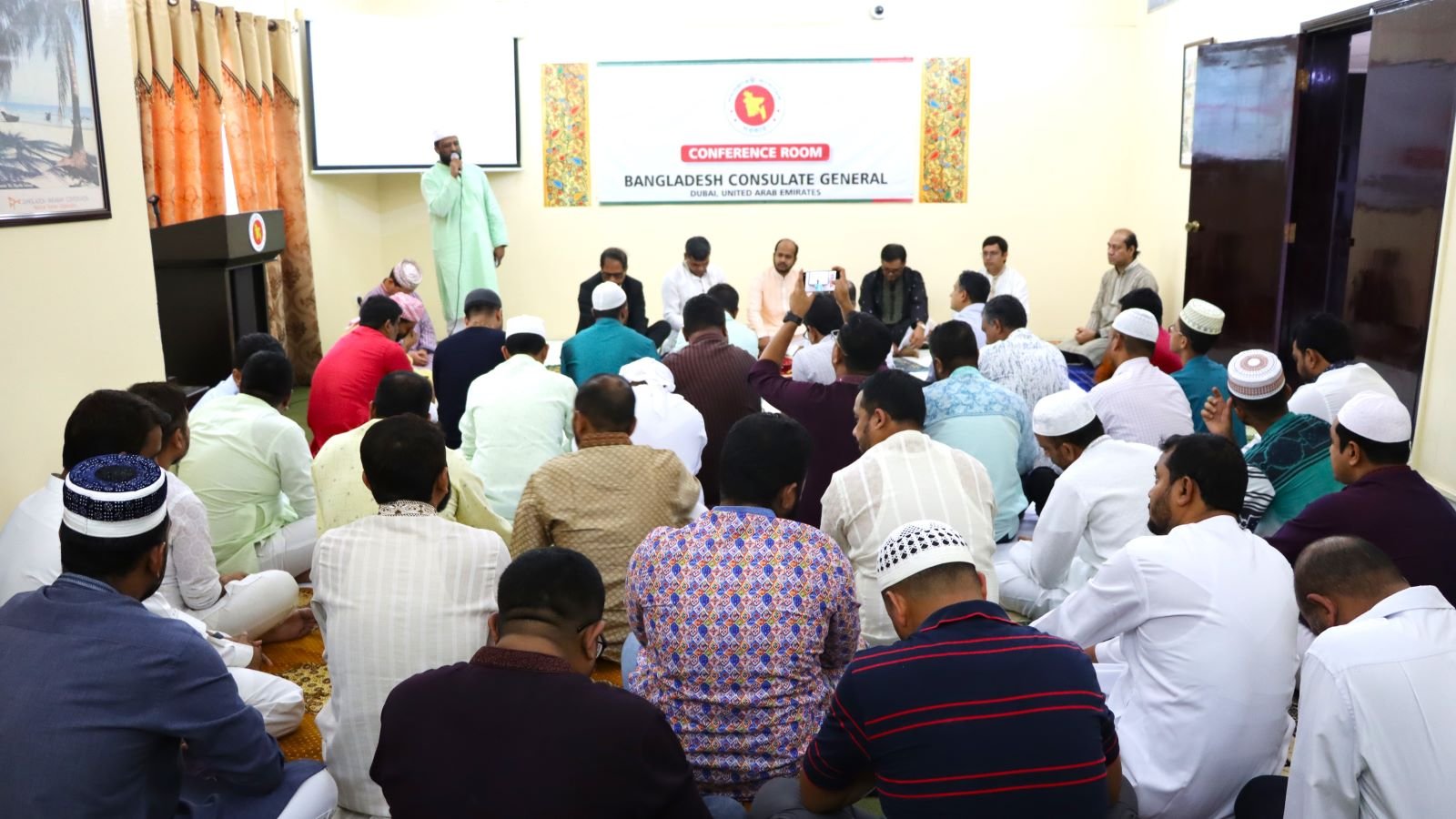 মান্যবর কনসাল জেনারেল বি এম জামাল হোসেনের সভাপতিত্বে অনুষ্ঠিত এই মিলাদ ও দোয়া মাহফিলে বাংলাদেশ কনস্যুলেট জেনারেল, দুবাই ও উত্তর আমিরাতের সকল কর্মকর্তা-কর্মচারী অংশগ্রহন করেন। পবিত্র কোরআন ও হাদীসের আলোকে বিশ^নবী হযরত মুহাম্মদ (সা.) এর জীবনাদর্শ নিয়ে বক্তাগণ আলোচনা করেন। আলোচনায় আখেরী নবী ও রাসুল হযরত মুহাম্মদ (সা.) এর জন্ম ও ওফাতের দিন ১২ই রবিউল আউয়াল এর গুরুত্ব ও তাৎপর্য তুলে ধরা হয়। বক্তাগণ বলেন, শৈশব থেকেই তিনি তাঁর সত্যবাদিতা, ন্যায়পরায়নতা, বিচক্ষণতা, দয়া-ক্ষমা-সহিষ্ণুতাসহ অনুপম চারিত্রিক গুণাবলীর জন্য আরব সমাজের সবার কাছে শ্রদ্ধাভাজন হয়ে উঠেছিলেন। বিশ্ব জগতের রহমত হিসেবে মহান আল্লাহ তায়ালা রাসুল হযরত মুহাম্মদ (সা.) কে পৃথিবীতে প্রেরণ করেছিলেন। এ কারনে তাঁকে ‘রহমাতুল্লিল আলামিন’ বলা হয়। সারা পৃথিবীর মুসলিমদের কাছে দিনটি অত্যন্ত পবিত্র ও মহিমান্বিত।