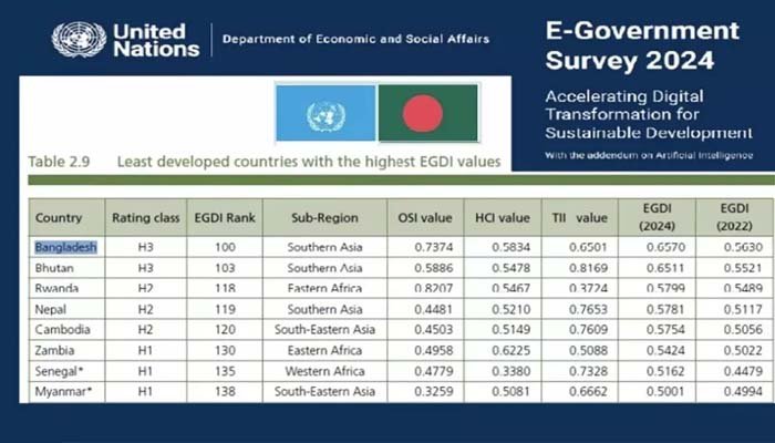 জাতিসংঘের ই-গভর্নমেন্ট সার্ভে ২০২৪ অনুযায়ী, এ বছর ১৯৩টি দেশের মধ্যে বাংলাদেশ এখন ১০০তম। গত বছর ছিল ১১১তম। ২০২০ সালের প্রতিবেদনে এই সূচকে বাংলাদেশের অবস্থান ছিল ১১৯তম।