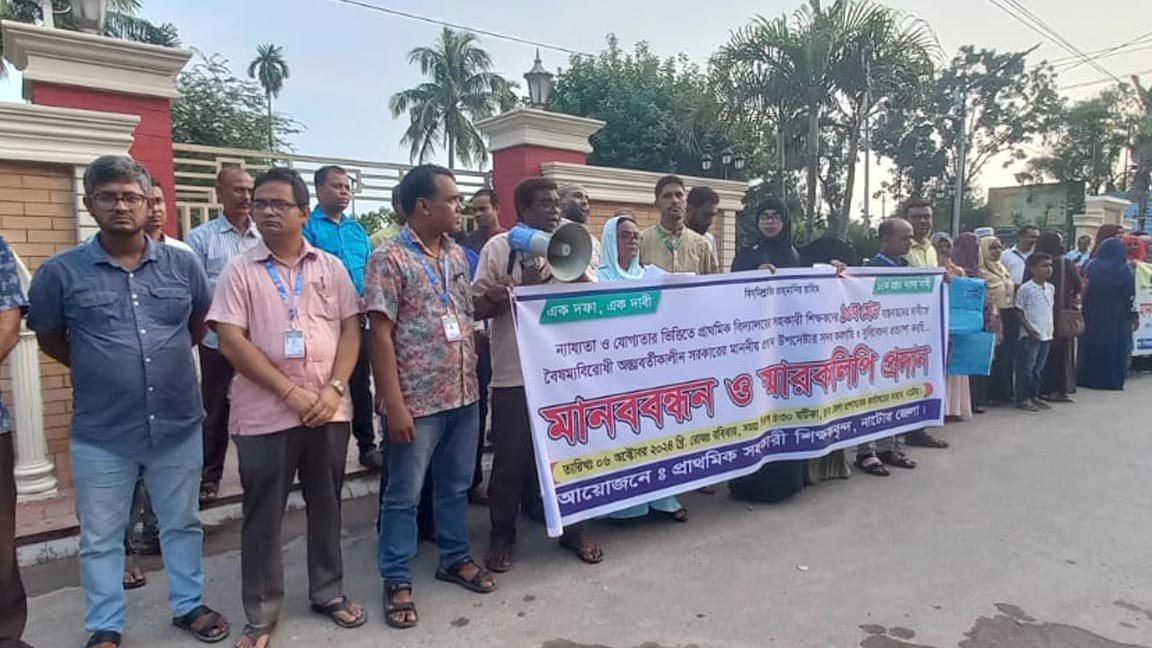 দশম গ্রেডে উন্নীতকরণের দাবিতে নাটোরে সরকারি প্রাথমিক বিদ্যালয়ের সহকারি শিক্ষকদের মানববন্ধন