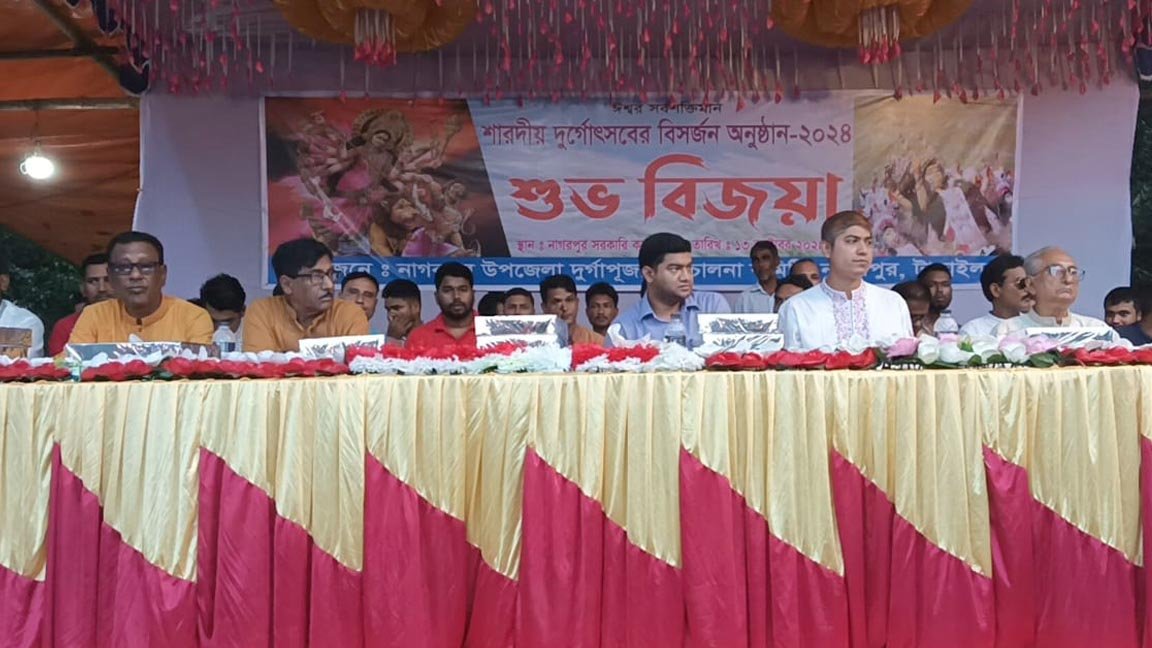 বিজয়ী দশমীর মেলার অনুষ্ঠানে নাগরপুর উপজেলা দুর্গা পূজা পরিচালনা কমিটির সভাপতি শিব শংকর সূত্রধরের সভাপতিত্বে হিন্দু সম্প্রদায়ের প্রবীণ নেতা বীর মুক্তিযোদ্ধা বাবু নূপুর পোদ্দার এর সঞ্চালনায় বিজয়া দশমীর মেলায় প্রধান অতিথি হিসেবে উপস্থিত ছিলেন টাঙ্গাইল জেলার নির্বাহী ম্যাজিস্ট্রেট মো: মাহমুদুল হাসান।